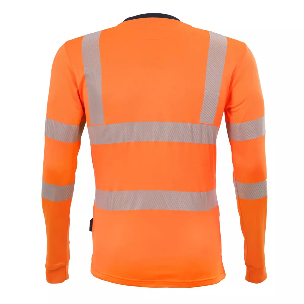 40+ UV-védőfaktorral, comfort fit szabással, 5 cm széles, szegmentált, rugalmas fényvisszaverő csíkokkal, kerek nyakkal, nyakszalag és ipari mosásra alkalmas gallérkialakítással, a karokon, vállakon és szegélyen strapabíró dupla varrással és CE minősítéssel rendelkező jól láthatósági hosszú ujjú póló, amely lélegző, izzadságelnyelő, nedvességszabályozó.