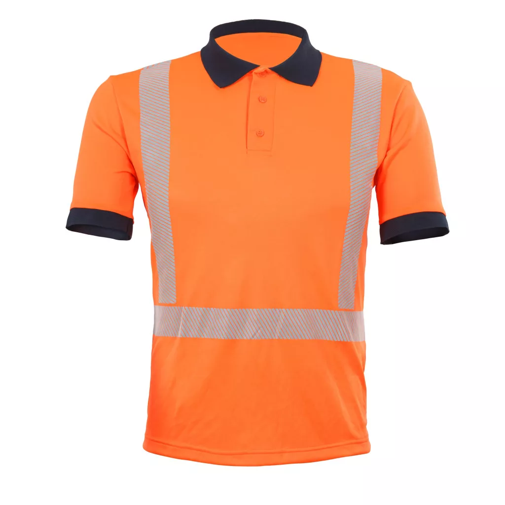 40+ UV-védőfaktorral, comfort fit szabással, 5 cm széles, szegmentált, rugalmas fényvisszaverő csíkokkal, kerek nyakkal, nyakszalag és ipari mosásra alkalmas gallérkialakítással, a karokon, vállakon és szegélyen strapabíró dupla varrással és CE minősítéssel rendelkező jól láthatósági rövid ujjú pólóing, amely lélegző, izzadságelnyelő, nedvességszabályozó.