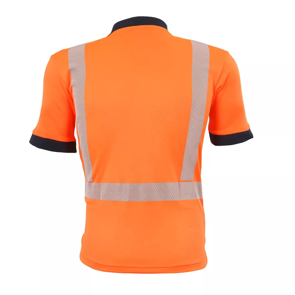 40+ UV-védőfaktorral, comfort fit szabással, 5 cm széles, szegmentált, rugalmas fényvisszaverő csíkokkal, kerek nyakkal, nyakszalag és ipari mosásra alkalmas gallérkialakítással, a karokon, vállakon és szegélyen strapabíró dupla varrással és CE minősítéssel rendelkező jól láthatósági rövid ujjú pólóing, amely lélegző, izzadságelnyelő, nedvességszabályozó.