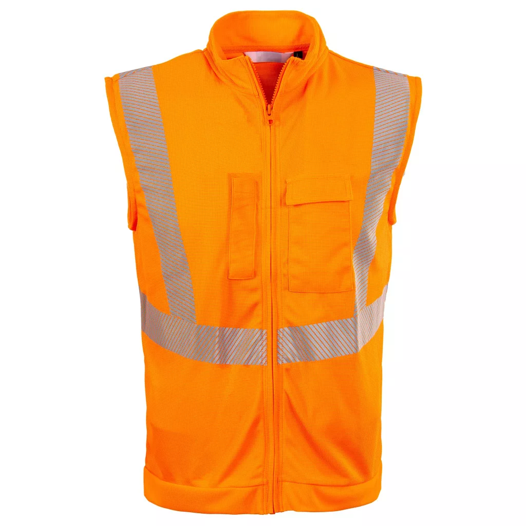 Szegmentált fényvisszaverő csíkokkal, praktikus állógallérral, rávarrt mellzsebekkel (a bal oldalon fedéllel ellátott mellzsebbel, a jobb oldalon tolltartó mellzsebbel), teljes hosszúságú, kiváló minőségű elülső cipzárra és CE minősítéssel rendelkező jól láthatósági mellény.